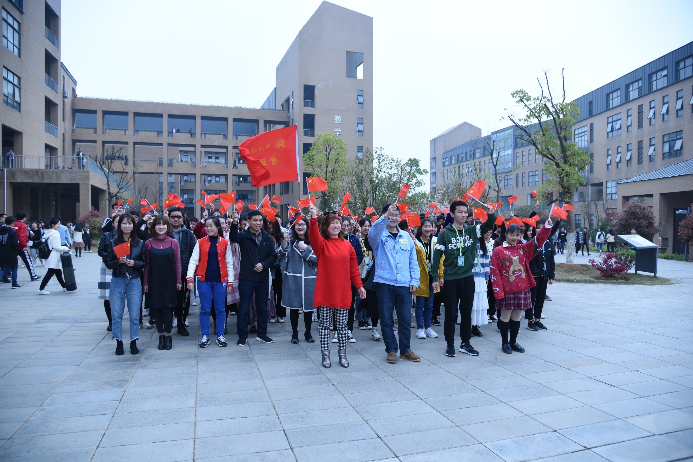 “唱响爱国风,实践爱国心;建国七十年,晴川谱诗篇;十佳歌手赛,就等你来战”的口号,声音洪亮,精神饱满,整齐划一,口号喊完后大家挥舞手中的红旗然后迅速散开。至此,此次“歌唱祖国”快闪活动圆满结束。