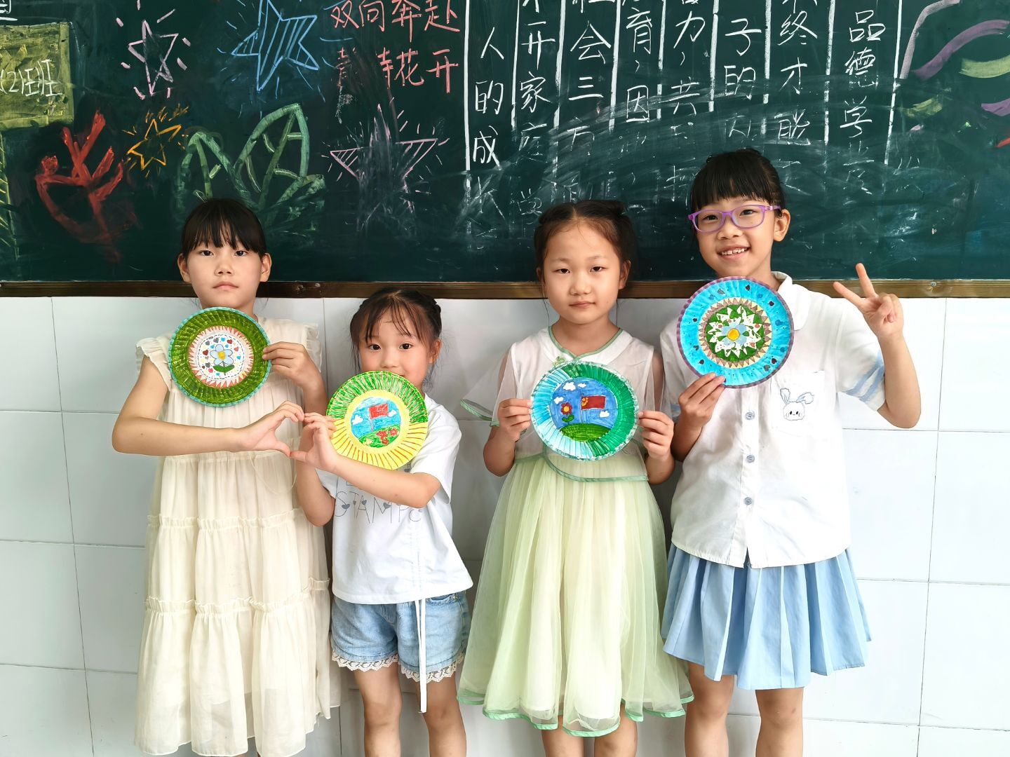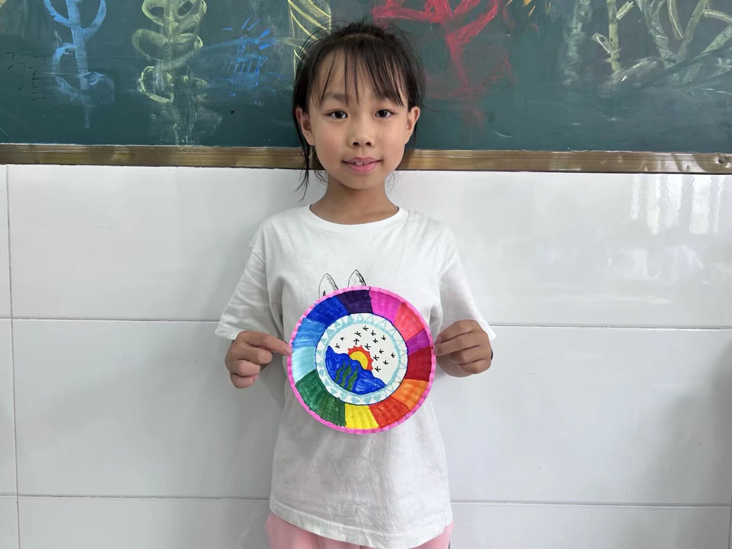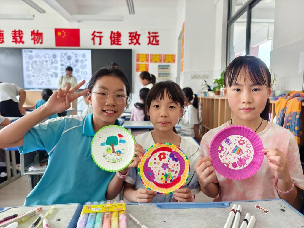 随后学生们拿起画笔动手创作,把校园里的大树、天上的云朵、动画里的卡通形象等,都化作盘子上灵动的图案。笔尖划过纸盘的沙沙声中,教室里的笑声与彩色颜料一同漾开,暖意融融。三十余件充满童趣的盘画作品在窗台上一字排开,每件作品都藏着孩子们的奇思妙想。那一刻,非遗不再是课本里遥远的名词,而是能捧在手心的快乐与美好。