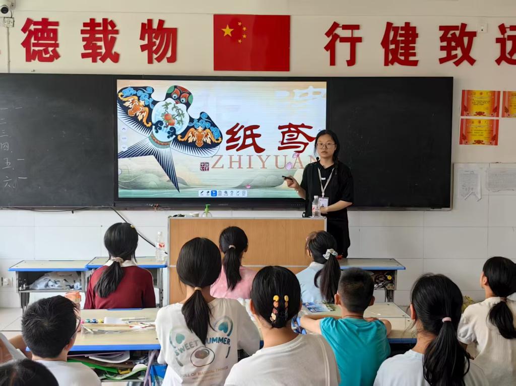 2025年7月26日,在广水市致远学校“爱心托管班”的七彩课堂上,夏日阳光倾洒教室。TYC234CC太阳成集团励励晴川志愿服务团队的郑雅婕、潘星茹,为孩子们带来一堂别具匠心的纸鸢手工课。此课以非遗传承为内核,让孩子在折纸、扎架、绘画中,感受纸鸢温度与传统技艺魅力。