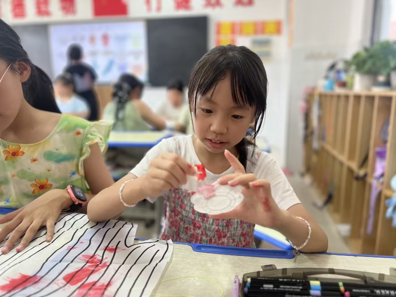 调色盘如许愿池:蝙蝠衔福、牡丹拥春、太阳燃梦、火箭探星…… 颜料落处,彩纸便生出飞翔的心愿。