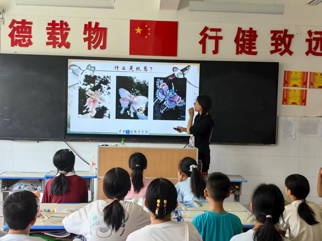 “是鸟不会叫,是鹰没有毛。有风飞得高,无风往下掉。猜猜是什么?”课堂上,志愿者郑雅婕的谜语刚落,孩子们的小手瞬间高高扬起,如破土的春笋。当“风筝”的答案被齐声喊出,志愿者潘星茹展开一张沙燕风筝图介绍道:“它还有个更典雅的名字——纸鸢,这可是国家级非遗哦。”
