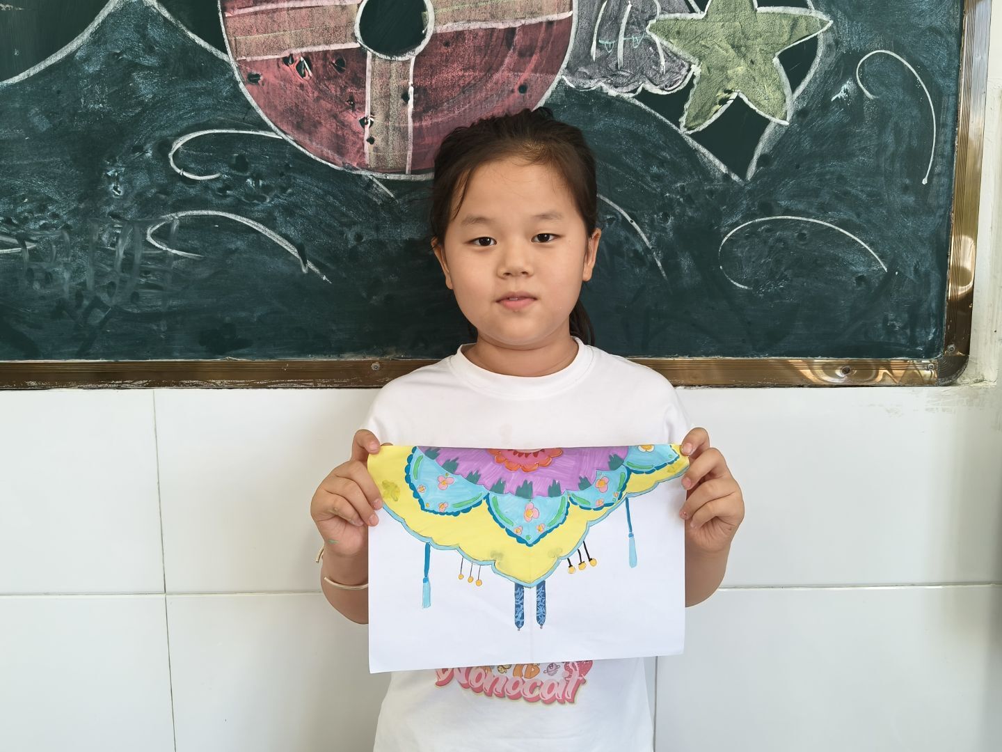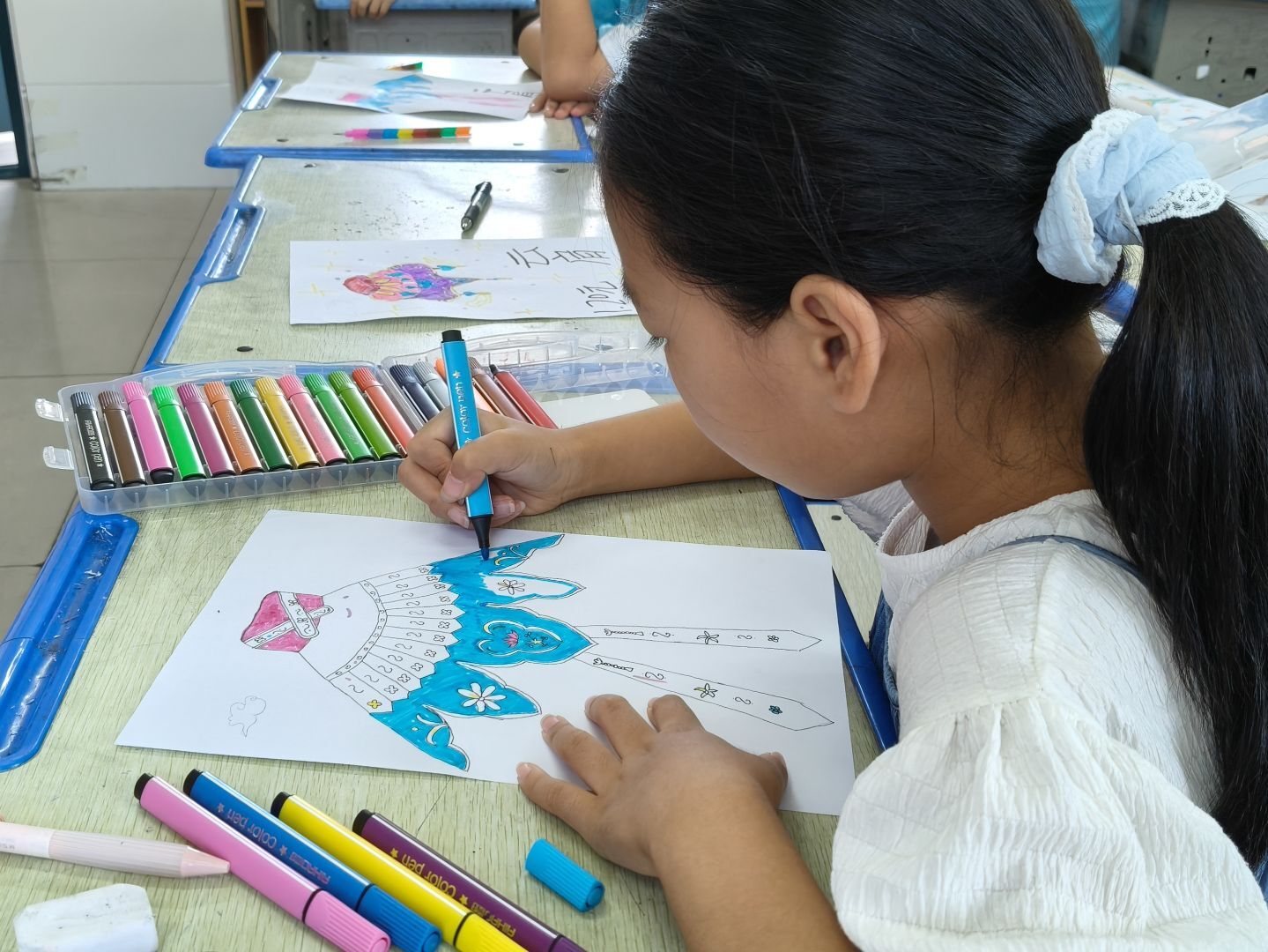 讲解完毕,孩子们迫不及待地拿起画笔,仿佛一群怀揣着梦想的小艺术家。瞧,那个孩子以传统花鸟纹样为蓝本,精心勾勒着每一片花瓣、每一根羽毛,仿佛能听到鸟儿的婉转啼鸣,看到花朵的娇艳绽放。一时间,教室里弥漫着艺术的气息,孩子们用画笔让云肩在纸上“活”了过来,古韵在笔尖肆意流淌。