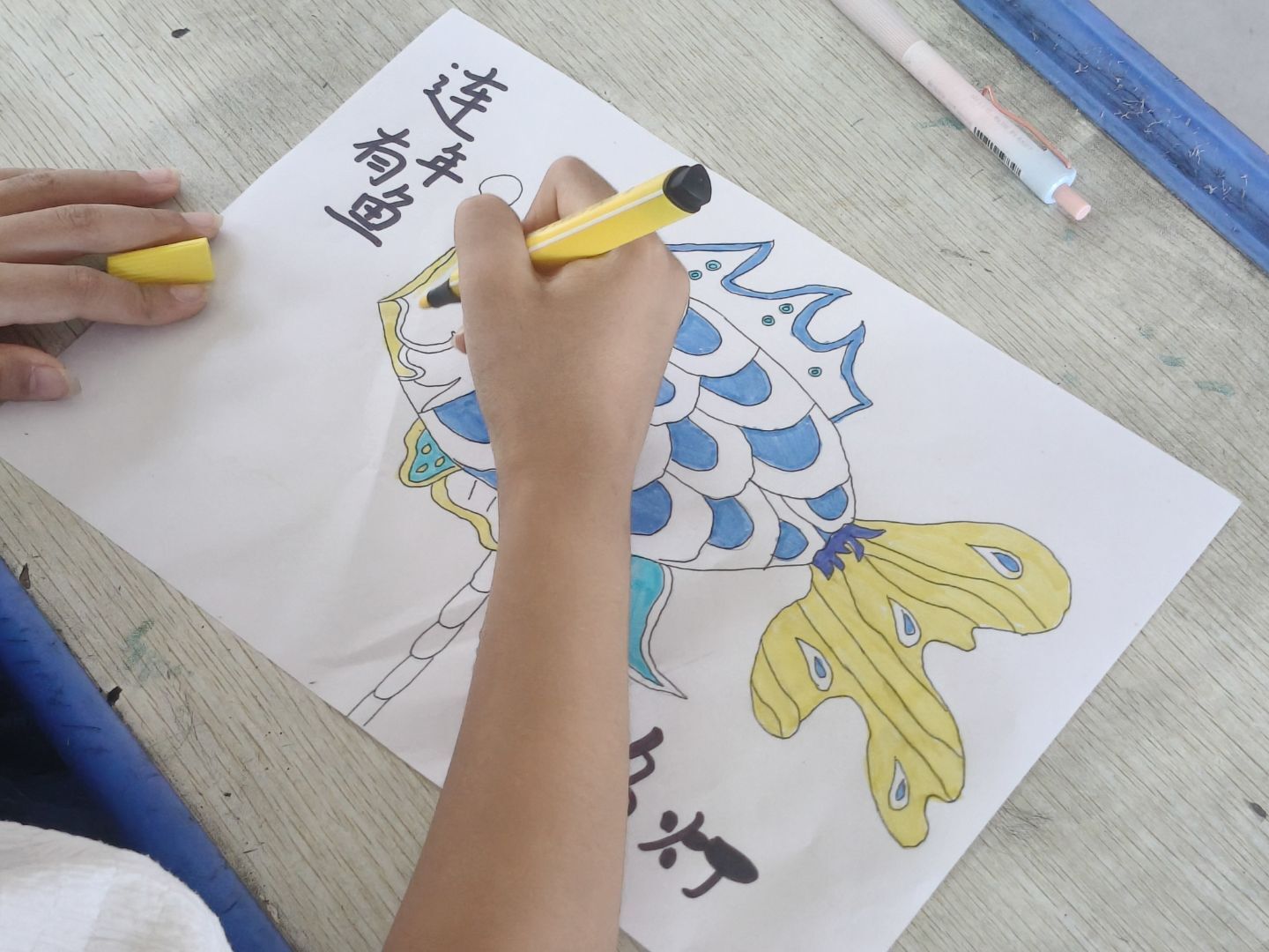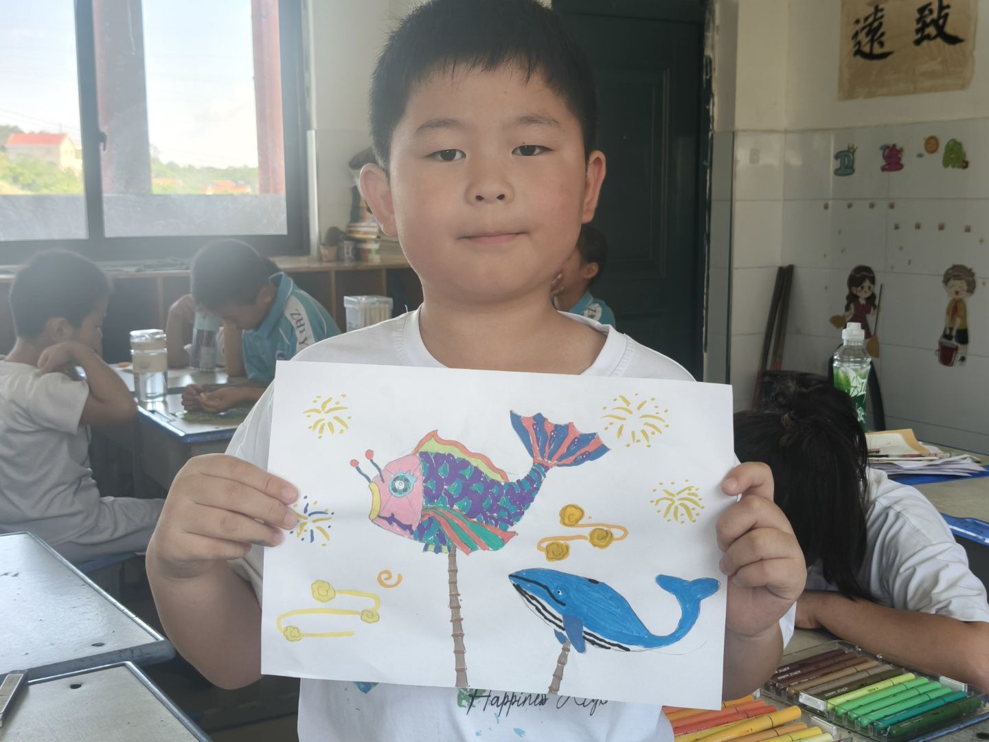 绘画创作环节,孩子们的想象力如脱缰的野马,肆意驰骋。他们用手中的画笔,为鱼灯赋予了新的生命。有的鱼灯色彩斑斓,红、黄、蓝、绿交织在一起,仿佛在水中欢快地游动,要带着孩子们去探索神秘的水底世界;有的鱼灯被画上了梦幻的背景,有闪烁的星星、飘浮的云朵,让鱼灯成了童话世界里的精灵,带着孩子们的梦想在光影中翱翔。每一幅画都充满了童真与创意,是孩子们对鱼灯非遗的独特解读。