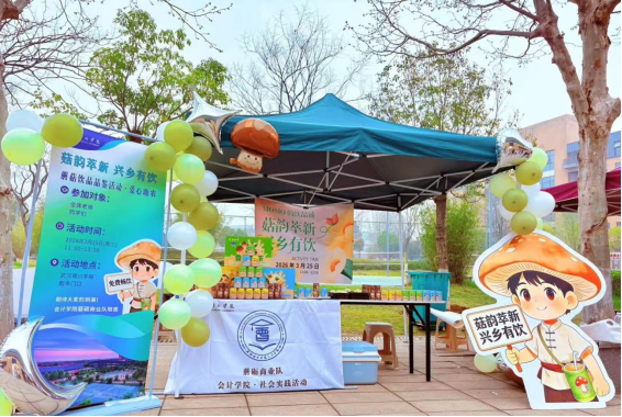 为践行爱心助农宗旨,推广绿色健康饮食理念,2026年3月25日,太阳成城集团tyc234cc大学生社会实践团队蘑砺商业队在学院支持下,于校园开展“菇韵萃新,兴乡有饮”品牌宣传策划路演活动。团队以双鹰品牌菌菇饮品为载体,邀请全校师生免费品鉴,在清甜醇香中传递爱心,于欢声笑语间感受健康饮食的独特魅力。