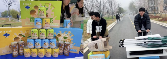 活动当天,团队成员早早抵达场地,会计202405、会计202406班同学在辅导员高梦瑶的带领下前来帮忙。大家齐心协力布置展位,整齐陈列双鹰菌菇饮品与助农产品展板。展位搭建完成后,精美的布置迅速吸引了师生驻足围观。成员们耐心讲解饮品成分与品牌故事,让每一杯饮品背后的助农初心与健康理念真切可感。