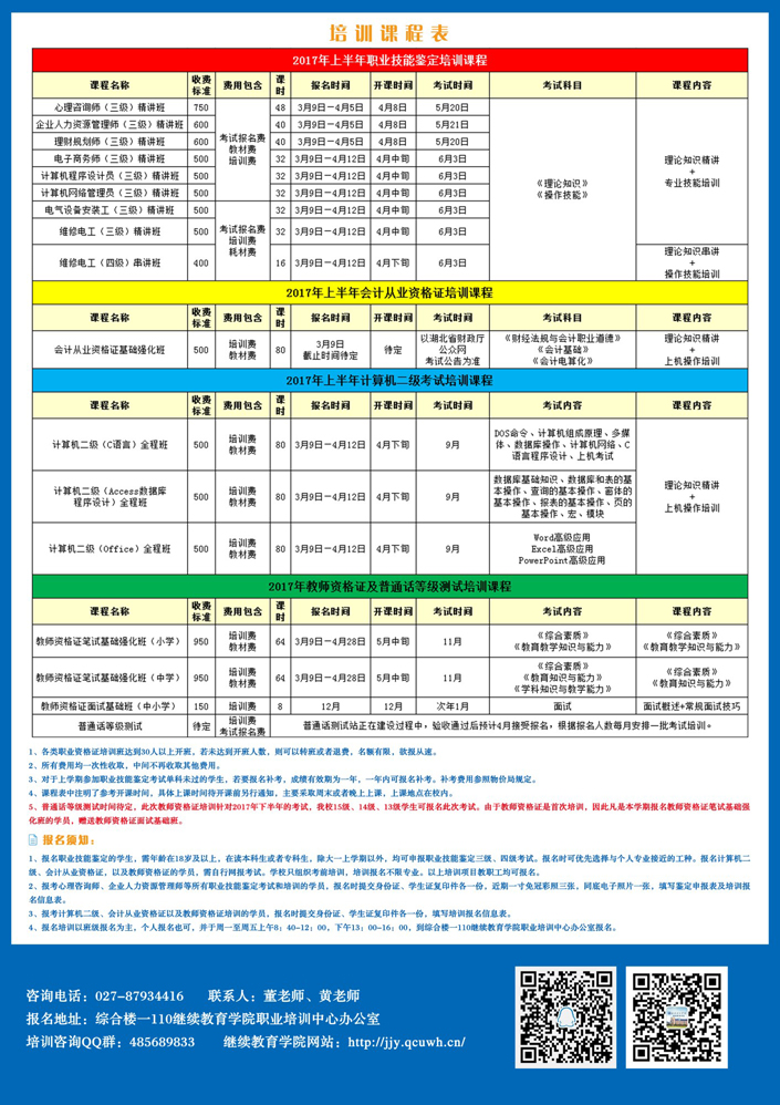 本学期主推的培训项目有:心理咨询师、企业人力资源管理师、理财规划师、电子商务师、计算机程序设计员、计算机网络管理员、电气设备安装工、维修电工、会计考证、计算机二级、教师资格证,以及普通话测试(培训课程参照附件一)。