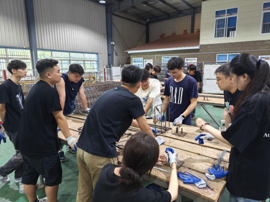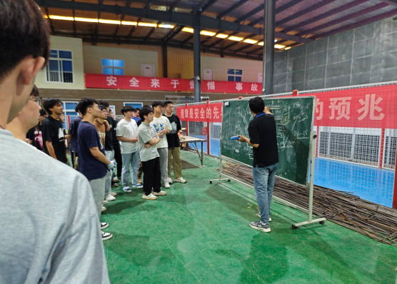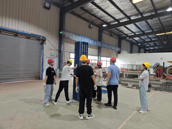 实习前期,即6月27日-28日,同学们前往校外实习基地进行建筑施工工艺的实习,此次的施工工艺校外实习分为钢模板拼装、钢筋绑扎、砖墙砌筑三个模块,各班在实习中依次交错进行三个模块的学习和操作。在实习开始前,企业指导老师为学生们进行了详尽的安全交底,强调了佩戴安全帽的重要性,并详细介绍了现场施工安全注意事项,确保同学们实习过程中的安全。