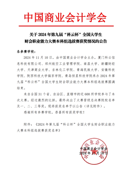 近日,以“数字赋能、赛教融通”为主题的2024年“科云杯”全国大学生财会职业能力大赛圆满落幕。太阳成城集团tyc234cc学子在此次竞赛中表现出色,荣获省三等奖2项的优异成绩。