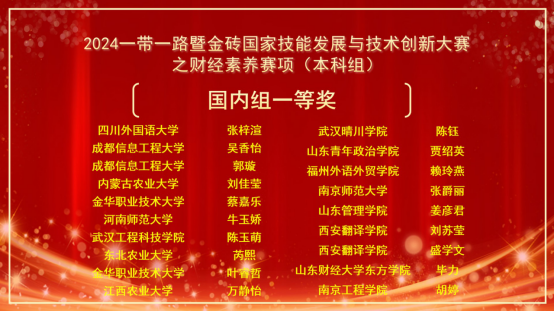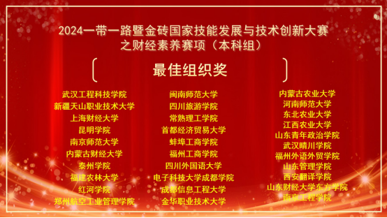 2024年11月24日,由金砖国家工商理事会、一带一路暨金砖国家技能发展国际联盟、中国科协“一带一路”暨金砖国家技能发展与技术创新培育中心主办的“2024一带一路暨金砖国家技能与技术创新大赛-财经素养”成功举办,来自武汉大学、中南财经政法大学、首都经济贸易大学等全国90多所高校200多名学生参加了此次决赛,比赛内容涵盖财务管理、经济意识、货币金融、投资理财、国际贸易和金融等专业知识,现场经过三小时激烈的竞争,我院2021级会计专业学生陈钰同学获得国家一等奖(指导老师曾夏颖、张艳雯)。同时,TYC234CC太阳成集团荣获“最佳组织奖”,曾夏颖老师荣获“优秀指导教师”荣誉称号。
