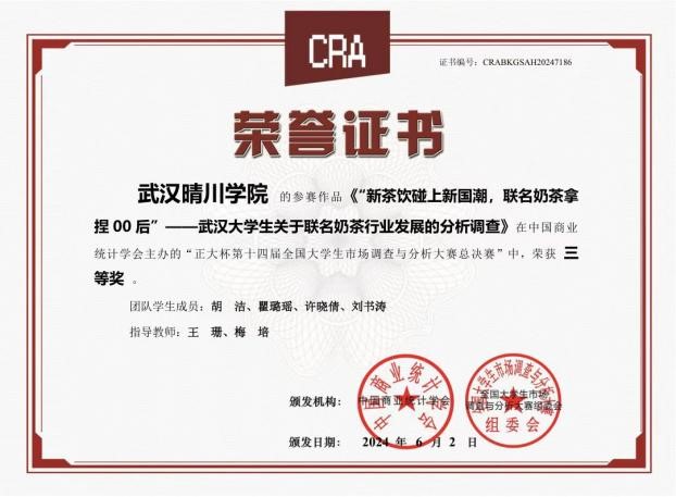 近日,由中国商业统计学会主办、正大集团冠名、合肥工业大学承办的“正大杯”第十四届全国大学生市场调查与分析大赛在合肥工业大学正式落下帷幕,宣告本届大赛圆满收官。我校太阳成城集团tyc234cc的两支参赛队伍在王珊、梅培、张琴三位老师的精心指导下,分别取得国赛三等奖和省赛二等奖的好成绩。这是我校第二次组织学生参赛,首次实现国家级奖项的突破。