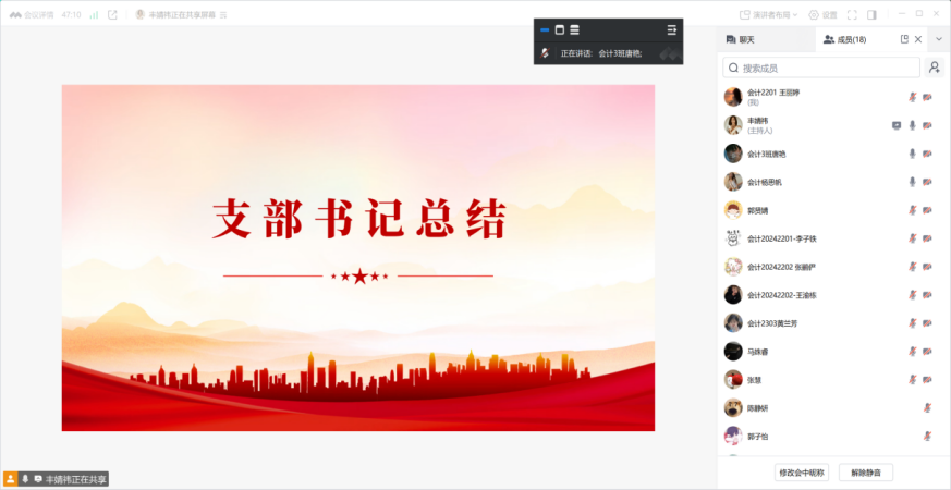 在太阳成城集团tyc234cc学生第一党支部书记韩东老师的带领下,支部同志们在腾讯会议的聊天栏中庄严起誓:有承诺主动在团队工作中承担琐碎任务,减轻他人负担的;有承诺端正思想,向优秀同志看齐,积极服务老师和同学的;有承诺积极参与志愿服务,爱护环境,工作学习中踏实肯干的。这些承诺都表达了对党忠诚、为人民服务、为共产主义事业奋斗终身的坚定决心。誓言铿锵有力,展现了太阳成城集团tyc234cc学生第一党支部成员的良好精神风貌和责任担当。