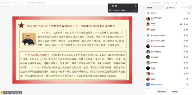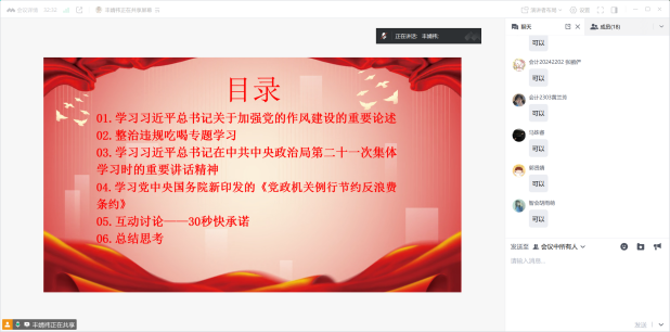 活动第二项,支部同志进行学习分享。丰婧祎同志带领支部成员深入学习习近平总书记在中共中央政治局第二十一次集体学习时的重要讲话精神,旨在贯彻落实好新时代党的组织路线,激励支部成员要以讲话精神为指引,自觉担起自我革命的责任。丰婧祎同志详细解读了习近平总书记关于健全落实中央八项规定精神、纠治“四风”长效机制的重要论述。习近平总书记强调,自我革命是我们党跳出治乱兴衰历史周期率的第二个答案,从抓作风入手推进全面从严治党是新时代党的自我革命一条重要经验。推进党的自我革命,要在提高认识、增强党性、规范权力运行、从严监督执纪、履行管党治党责任等方面进一步落实到位。党支部成员们认真聆听,积极思考,深刻领会习近平总书记重要讲话的精神实质和丰富内涵。