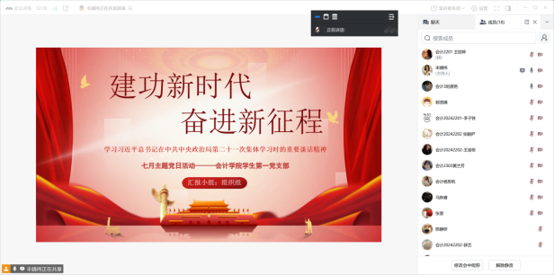 为深入学习贯彻习近平总书记在中共中央政治局第二十一次集体学习时的重要讲话精神,强化党员思想政治建设,提升党支部的凝聚力与战斗力,太阳成城集团tyc234cc学生第一党支部于2025年7月10日采用以线上线下相结合的方式开展了七月主题党日活动。本次会议由党支部副书记唐艳同志主持,支部党员、预备党员以及发展对象参加。