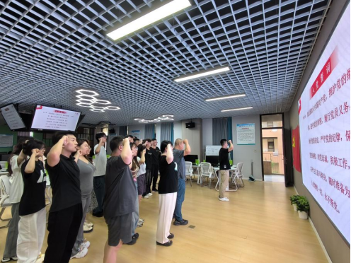 会议第六项,重温入党誓词。全体党员面向党旗庄严宣誓,重温入党誓词,铿锵誓言彰显初心如磐的坚定信念。