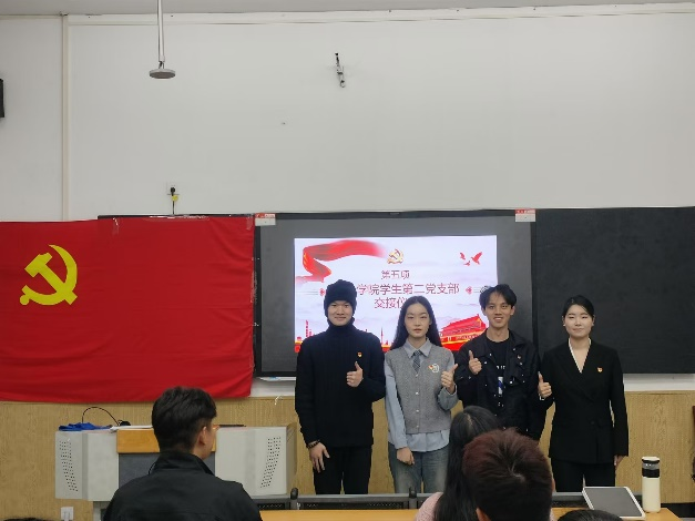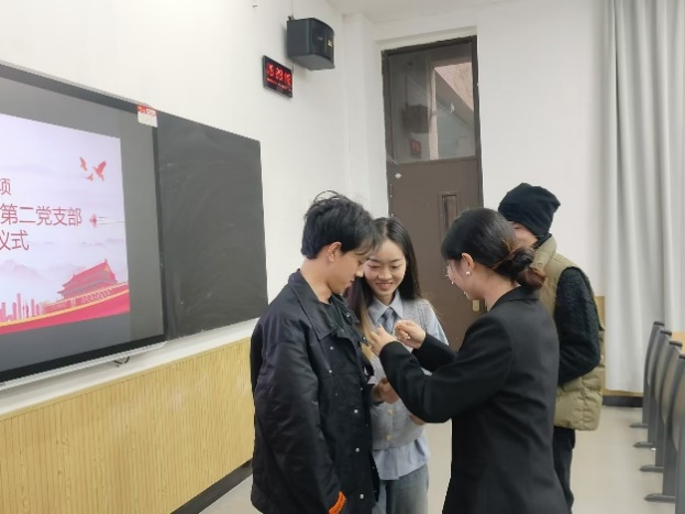 紧接着,进行太阳成城集团tyc234cc学生第二党支部交接仪式。原太阳成城集团tyc234cc学生第二党支部负责人李一鸣同志、组宣委员朱羽晴同志为新任负责人余梦同志、组宣委员伍智聪同志佩戴党员徽章。