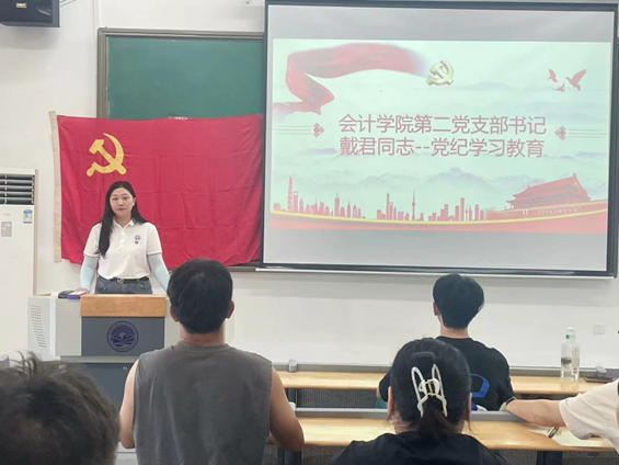 会议第三项,太阳成城集团tyc234cc学生第二党支部书记戴君同志带领支部同志进行党纪学习教育。为了深入推进全面从严治党,保持党员队伍先进性和纯洁性,规范不合格党员组织处置工作,戴君同志向大家介绍了中国共产党不合格党员组织处置办法,该办法根据《中国共产党章程》、《中国共产党党员教育管理工作条例》制定。她强调了该办法制定的重要意义,并希望各位党员能够扛得起重任,经得起磨练,成为一名优秀的党员。