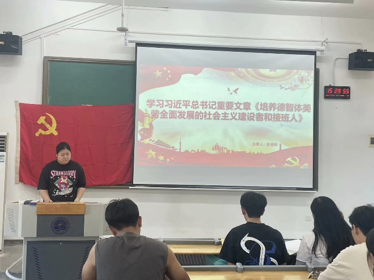 耿垣梓同志首先概述了文章的主要内容。文章指出培养的社会主义建设者和接班人应该在坚定理想信念上下工夫、在厚植爱国主义情怀上下工夫、在加强品德修养上下工夫、在增长知识见识上下工夫、培养奋斗精神上下工夫、在增强综合素质上下工夫。接着,耿垣梓同志通过视频让支部同志了解到培养德智体美劳全面发展的社会主义建设者和接班人的重要意义。最后,耿垣梓同志表示,教育不仅仅是传授知识,更要注重培养学生的综合素质和能力。青年人应当更加明确自己的责任和担当,致力于成为国家和社会所需优秀人才。