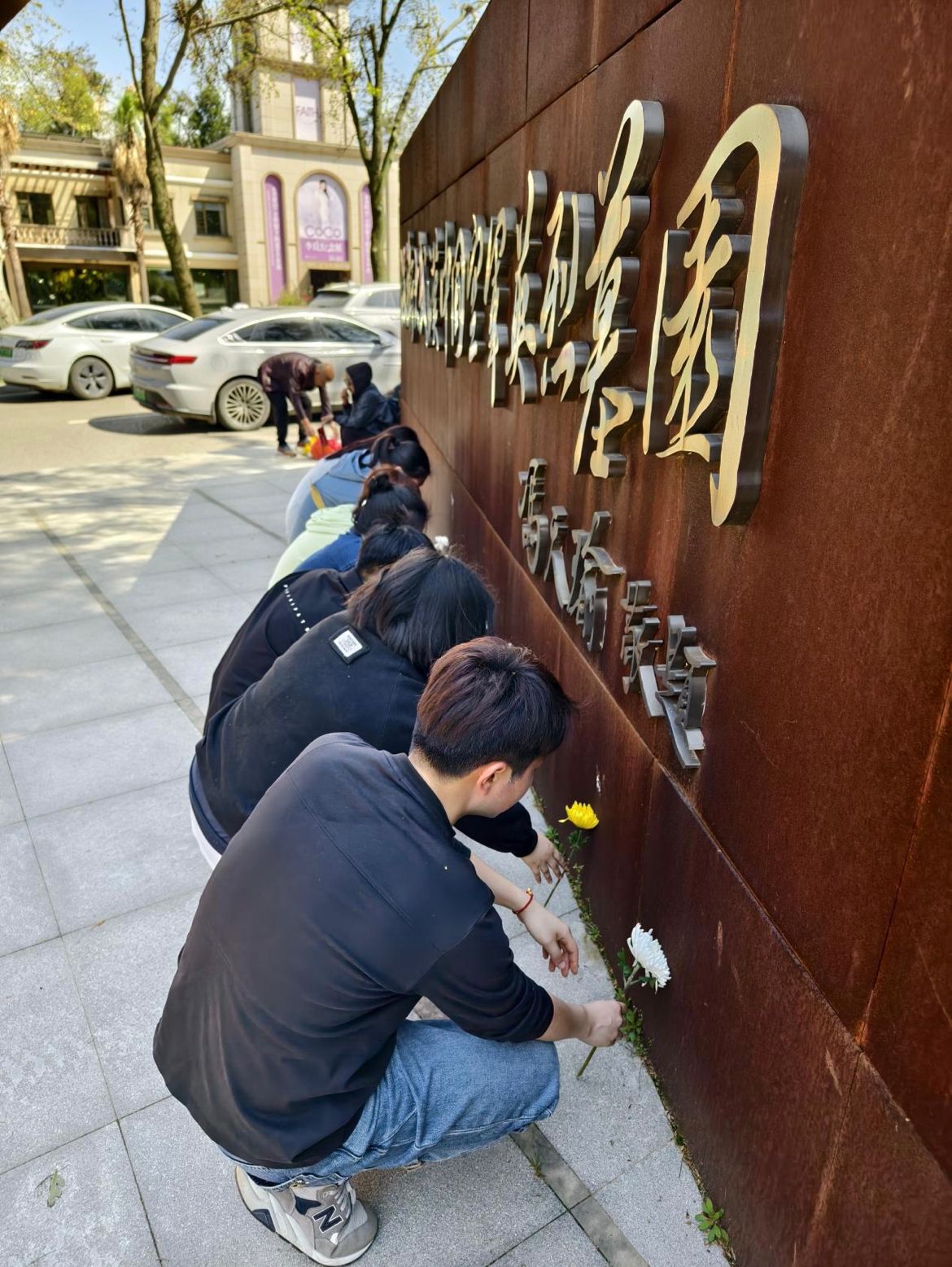 中国抗日空军英烈纪念广场也是石门峰纪念院内一处鲜花环抱之地,同学们在此向武汉会战中牺牲的中国空军将士们驻足鞠躬致意。抗战期间,武汉上空曾发生过三次大规模空战,年轻将士们在战场上展现出面对侵略者的无畏勇气和担当精神。他们为国捐躯的事迹,让同学们感受到了深厚的爱国情怀。大家依次上前献花,以此表示对那段艰苦卓绝的抗战岁月中英勇牺牲的空军将士们的崇高致敬。