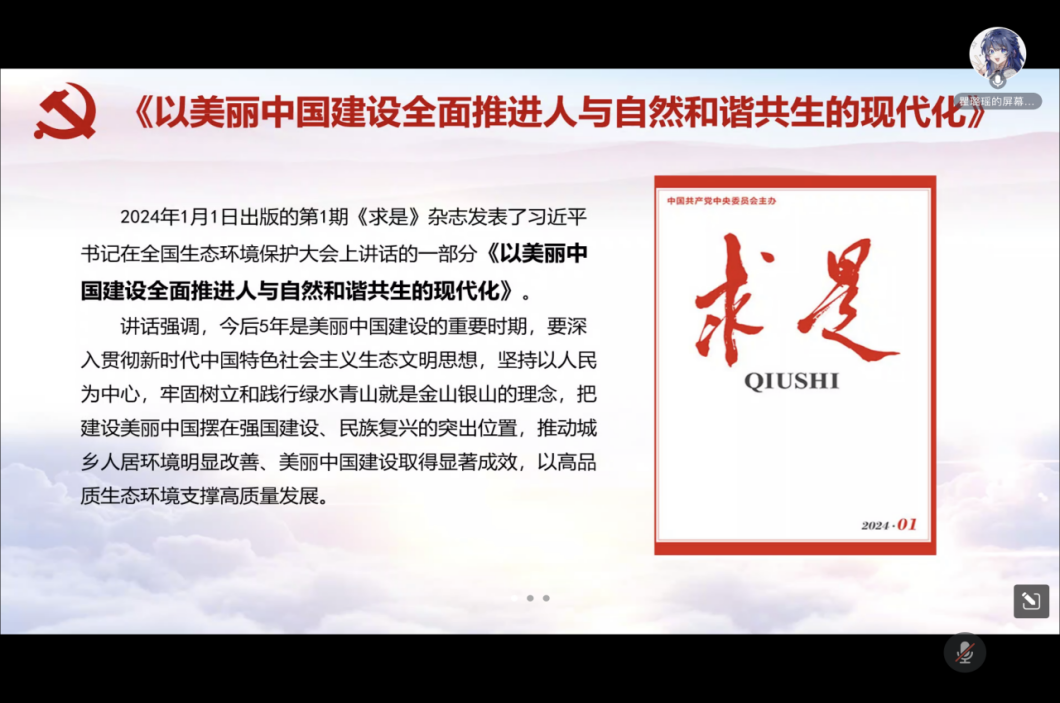 首先,会议开展了对习近平总书记《以美丽中国建设全面推进人与自然和谐共生的现代化》重要讲话的学习。会议中,大家围绕美丽中国建设、人与自然和谐共生、家乡变化等话题进行了深入的学习与分享。习近平总书记重要讲话强调,今后5年是美丽中国建设的重要时期,要深入贯彻新时代中国特色社会主义生态文明思想,坚持以人民为中心,牢固树立和践行绿水青山就是金山银山的理念,把建设美丽中国摆在强国建设、民族复兴的突出位置,推动城乡人居环境明显改善、美丽中国建设取得显著成效,以高品质生态环境支撑高质量发展。