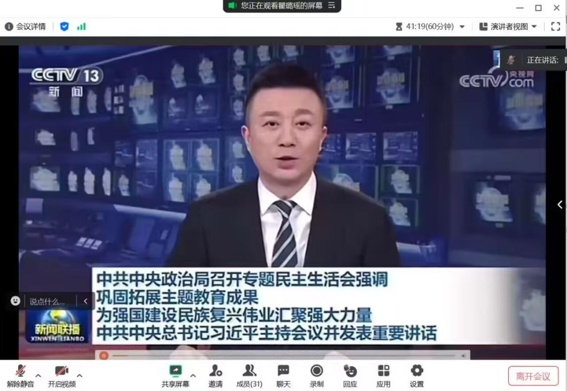 紧接着,会议第二部分开展学习习近平总书记在中共中央政治局民主生活会上的重要讲话精神,通过观看视频,大家了解到党员要深刻学习贯彻习近平新时代中国特色社会主义思想,做到维护党中央权威和集中统一领导,以身作则、廉洁自律,履行全面从严治党的政治责任,同时也要时刻保持解决大党独有难题的清醒与坚定,坚持不懈地推进党的自我革命。