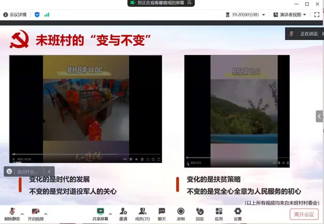 在学习会议上,孙荣华同志对于习近平总书记重要讲话内容深有体会,他表示能够切实感受到家乡未班村在党的带领下发生的巨大变化。他以“变与不变”的对比来阐述家乡的改变,并且向我们展示了家乡改变前后的图片与视频。他表示,随着时代的进步和扶贫策略的调整,家乡的面貌和村民的生活水平都有了显著提高,但村民对党的热爱之情始终如一,家乡的绿水青山依旧保持原貌,党对退役军人的关怀和全心全意为人民服务的宗旨也始终未变。孙荣华同志对未来充满信心,他相信在党组织的带领下,未班村将会迎来更加美好的明天。
