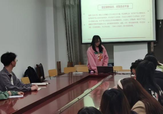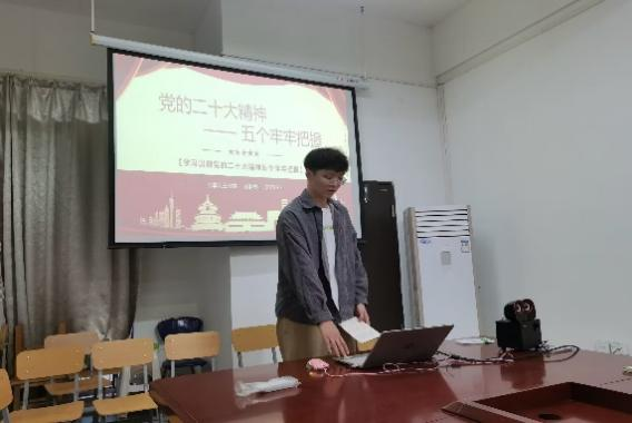 接着支部预备党员王勃森、张浩森、汪琪、贺贝佳和周航同志分别讲述了“五个牢牢把握”、“奋发有为的精神”、“悟中国精神,做时代青年”、“高举旗帜,凝聚力量,团结奋进”和“青年强则国强”的二十大精神内涵,既带领我们回顾了近几年来党的辉煌成绩,更加深刻地学习了解了大会的精神,又激励着我们怀抱梦想脚踏实地,立志做有理想有担当能吃苦的新时代好青年,为实现中华民族伟大复兴添砖加瓦。