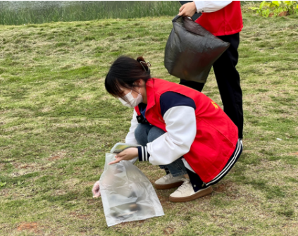 讲话过后,学员们分成两组,拿上自己事先准备好的垃圾袋,从操场出发绕湖进行“环保巡湖”。湖边多了两道红色的“风景线”,穿着红马甲的学员们本着“不怕脏,不怕累”的党员担当奉献精神,沿着湖边一次次弯腰拾捡那些藏在草里的烟蒂、包装袋、餐巾纸等垃圾。在“红马甲”们的一次次弯腰起身之后,情缘湖旁的草坪的卫生情况改善了许多,最后参与了本次活动的全体同学在情缘湖旁合影留念。