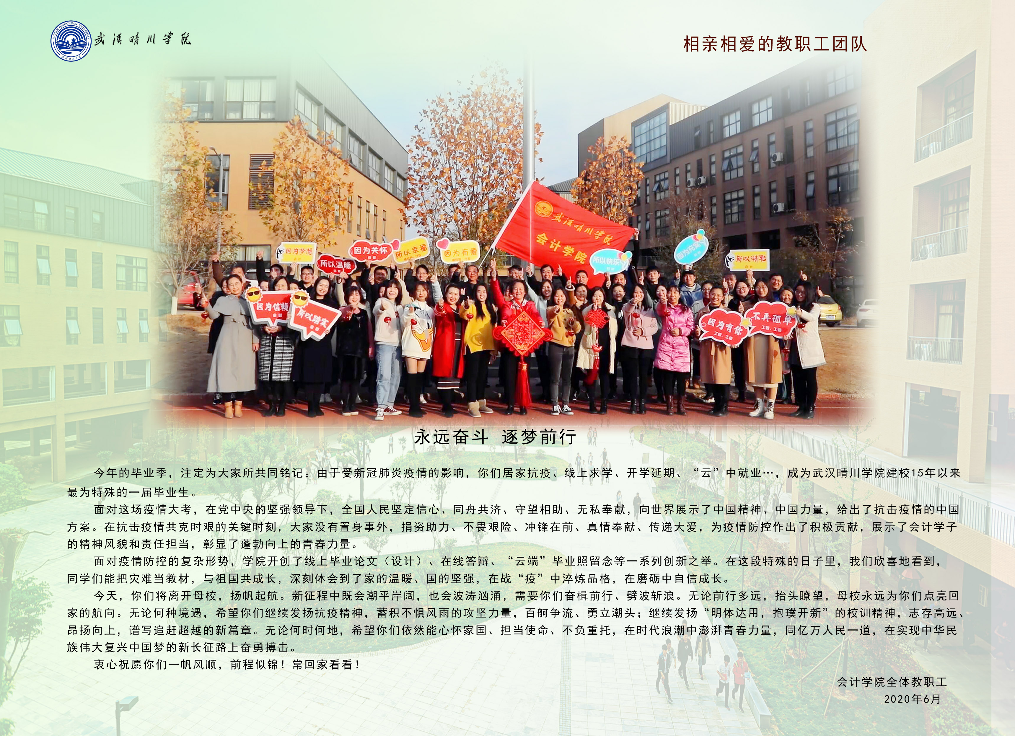 亲爱的同学,毕业快乐!你的手机里一定存了许多我的照片,我也在心中默默记录着你们四年的成长。想我了,就抬头看看,总有一角是晴川的天空。