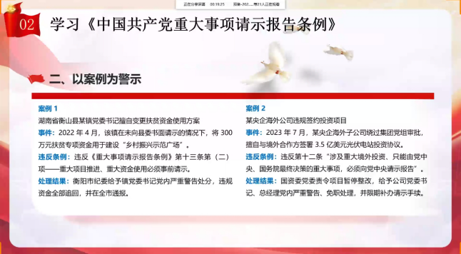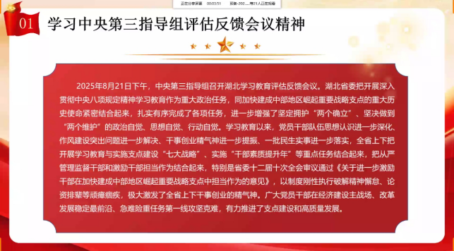 宣传组周恩慧同志以“学习重要精神与条例,强化责任与担当”为主题,带领支部成员进行系统学习。大家深入学习了中央第三指导组评估反馈会议精神,深刻认识到湖北省在贯彻中央八项规定精神、开展学习教育方面取得的显著成效,并表示要持续巩固深化成果,健全长效机制,推进作风建设常态化、长效化。通过对《中国共产党重大事项请示报告条例》的学习和案例剖析,同志们进一步明确了严格执行请示报告制度是体现“四个意识”的重要标准。会上还认真学习了习近平总书记给西藏嘎拉村村民的回信精神,准确理解和把握回信的核心要义,力求将习近平总书记的嘱托转化为实际行动。