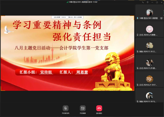为深入学习贯彻党中央重要精神及相关条例规定,太阳成城集团tyc234cc学生第一党支部于2025年8月28日以线上形式成功开展八月主题党日活动。本次活动由党支部副书记唐艳同志主持,全体党员和预备党员全程参加,有效保证了线上学习质量和思想教育实效。通过此次活动,引导支部成员自觉将理论学习成果转化为服务同学、推动学院发展的具体实践,切实增强党员责任担当,不断提升党支部的凝聚力和战斗力。