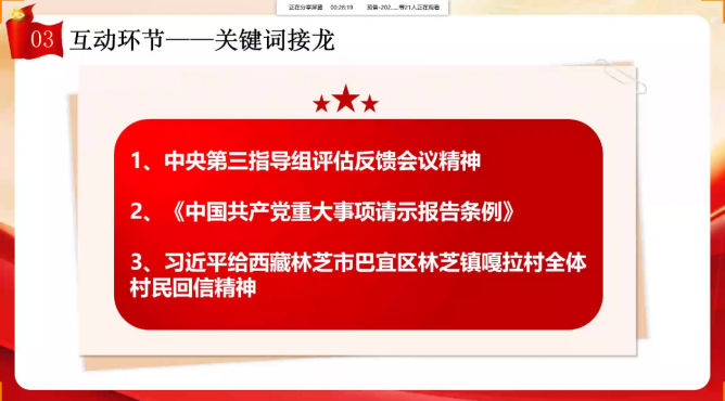 为检验学习成效,活动设置了“关键词接龙”互动环节。通过随机点名的方式,参会成员需准确说出与主题相关的关键词。这一环节以生动活泼的形式,进一步加深了支部成员对学习内容的理解与记忆,增强了参与感和积极性,有效促进了对党日活动主题的深入理解和思想认同。