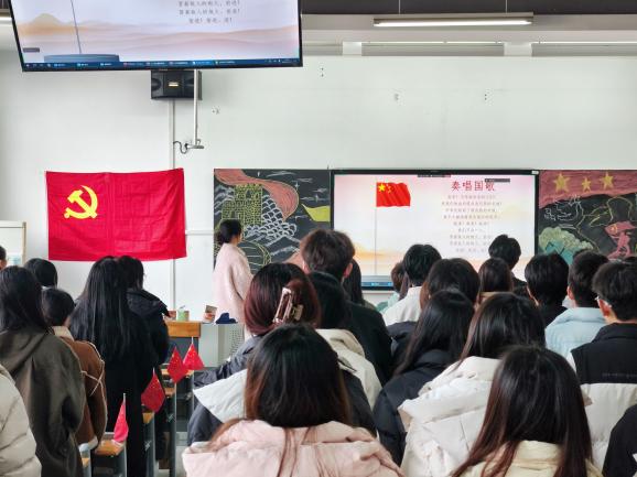 全体成员肃立齐唱国歌,激昂的旋律在教室中回响。每一位党员的初心使命愈发坚定,每一步奋进实干的脚步愈发铿锵。爱国情怀与责任担当在庄严肃穆的氛围中深深扎根。