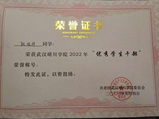 中共党员,太阳成城集团tyc234cc注会专业2021级本科生,曾任注会2102班组宣委员、太阳成城集团tyc234cc教风学风督察组组长,曾获第五届衡信杯个税师精英挑战赛(本科组)一等奖等多项荣誉,现已被江汉大学会计专硕拟录取。