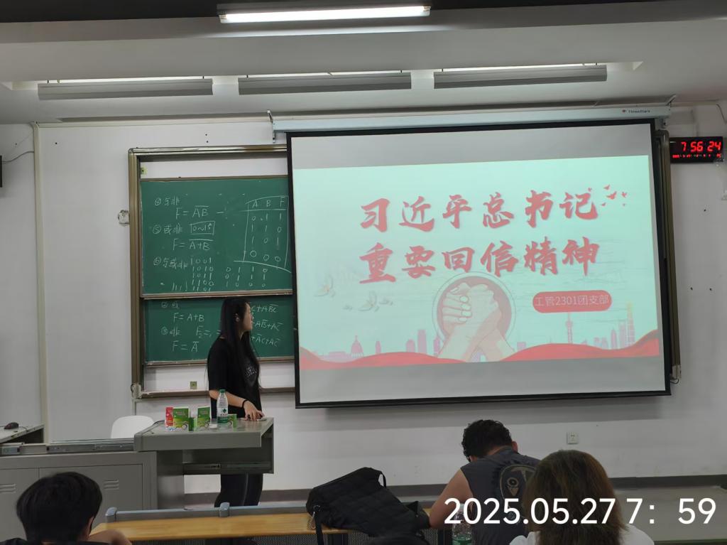 在新时代的伟大斗争中,习近平总书记的重要回信精神如同一座灯塔,照亮前行的道路,为深入理解并学习习近平重要回信精神,工管2301团支部特别策划以“学习习近平重要回信精神”为主题的团日活动,于2025年5月27日在教三-407召开。参加本次活动的成员为工管2301团支部全体,本次活动由黄燚同学主持。