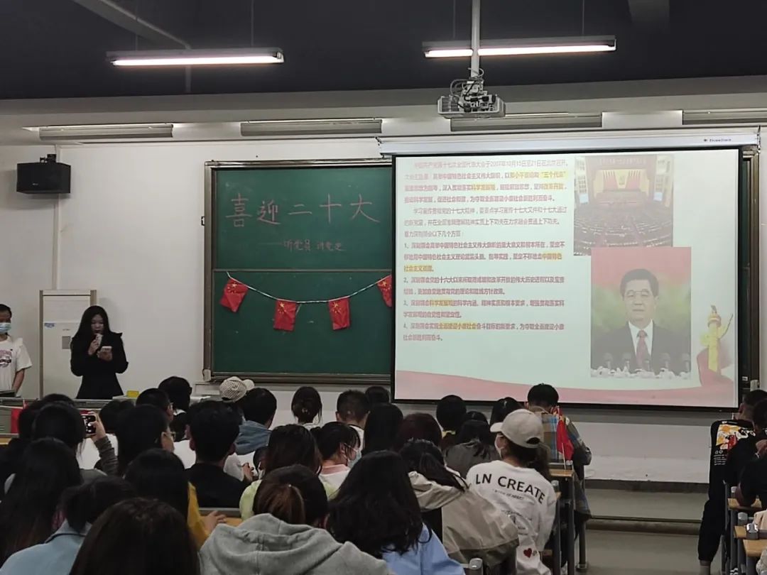 会议伊始,会计1902班王丹丹同志向班级同学们简单的介绍了二十大的内容,随后全体起立奏唱国歌,紧接着进行“听党员讲党史” 主题汇报。值得注意的是,本次主题班会是由两个专业17名学生党员采取轮流演讲的形式共同完成,各党员同志按照中共一大至中共十九大的顺序依次上台讲演,通过照片、视频等方式向同学们讲述中共一大至十九大的会议精神和主要内容。