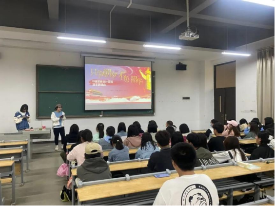 第二环节是智能会计实验班班助熊丁丁上台讲话。首先,熊丁丁学姐向同学们做了简单自我介绍,优秀的学姐为同学们树立了努力奋斗的榜样。其次,学姐要求同学们关注“晴川青年” 、“会院新青年”等公众号,并且要求同学们认真完成青年大学习的学习任务。此举不仅让同学们在班会课上了解党史、学习党史,更能让同学们在课下进行更进一步的学习。