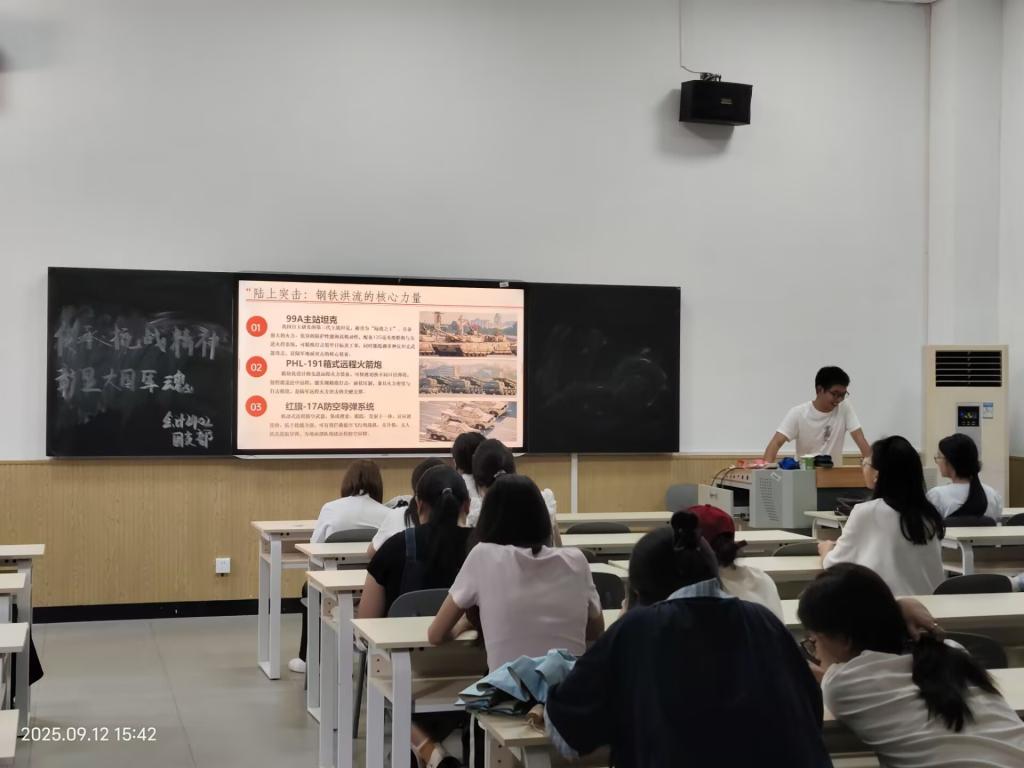 第三部分,同学们聚精会神,跟随罗致远同学的讲解,深入了解99A主战坦克、歼-20隐身战斗机等先进装备。这些“钢铁洪流”与“空中雄鹰”,是国防力量的硬核支撑,也让大家更深刻体会到,正是强大的国防,守护着和平,让抗战精神在新时代有了更坚实的底气传承。