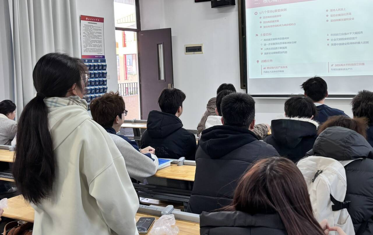 活动伊始,团支书朱滨彬率先解读全会背景:2025 年 10 月 20 日至 23 日,党的二十届四中全会在北京召开,核心议程是审议通过《中共中央关于制定国民经济和社会发展第十五个五年规划的建议》。她强调,“十五五” 时期是我国基本实现社会主义现代化的关键阶段,机遇与风险挑战并存,青年学子需主动把握时代脉搏,明晰自身责任。