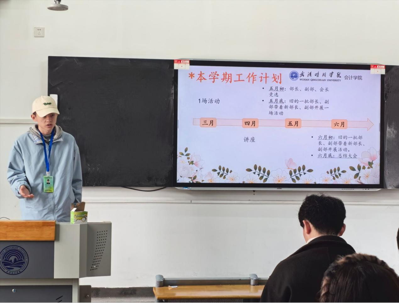 各个部门的部长就本学期的工作安排进行发言,讲述了各部门的工作定位与接下来的工作安排以及展望。