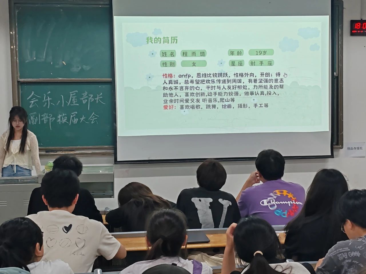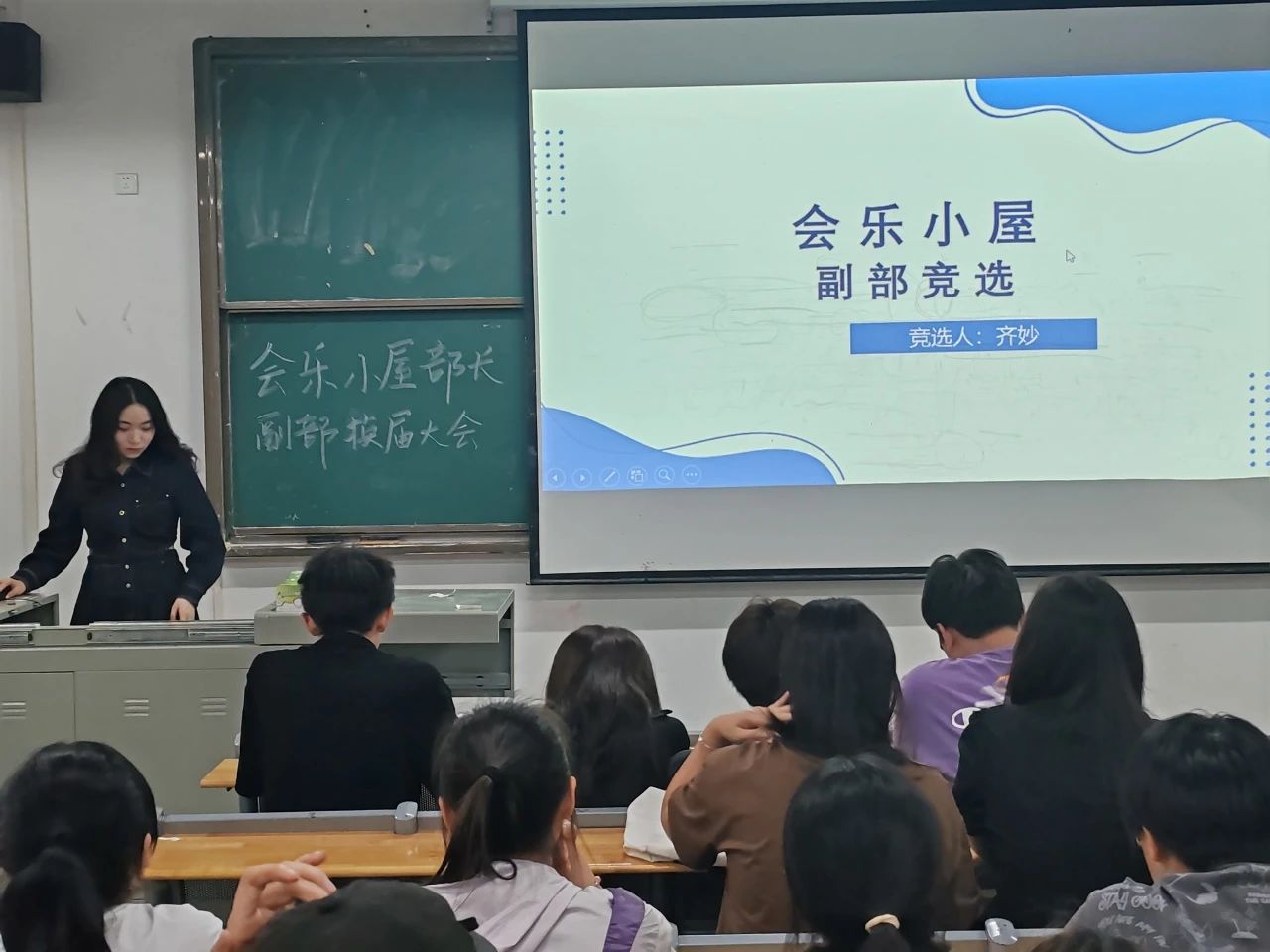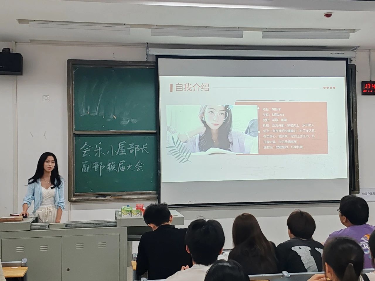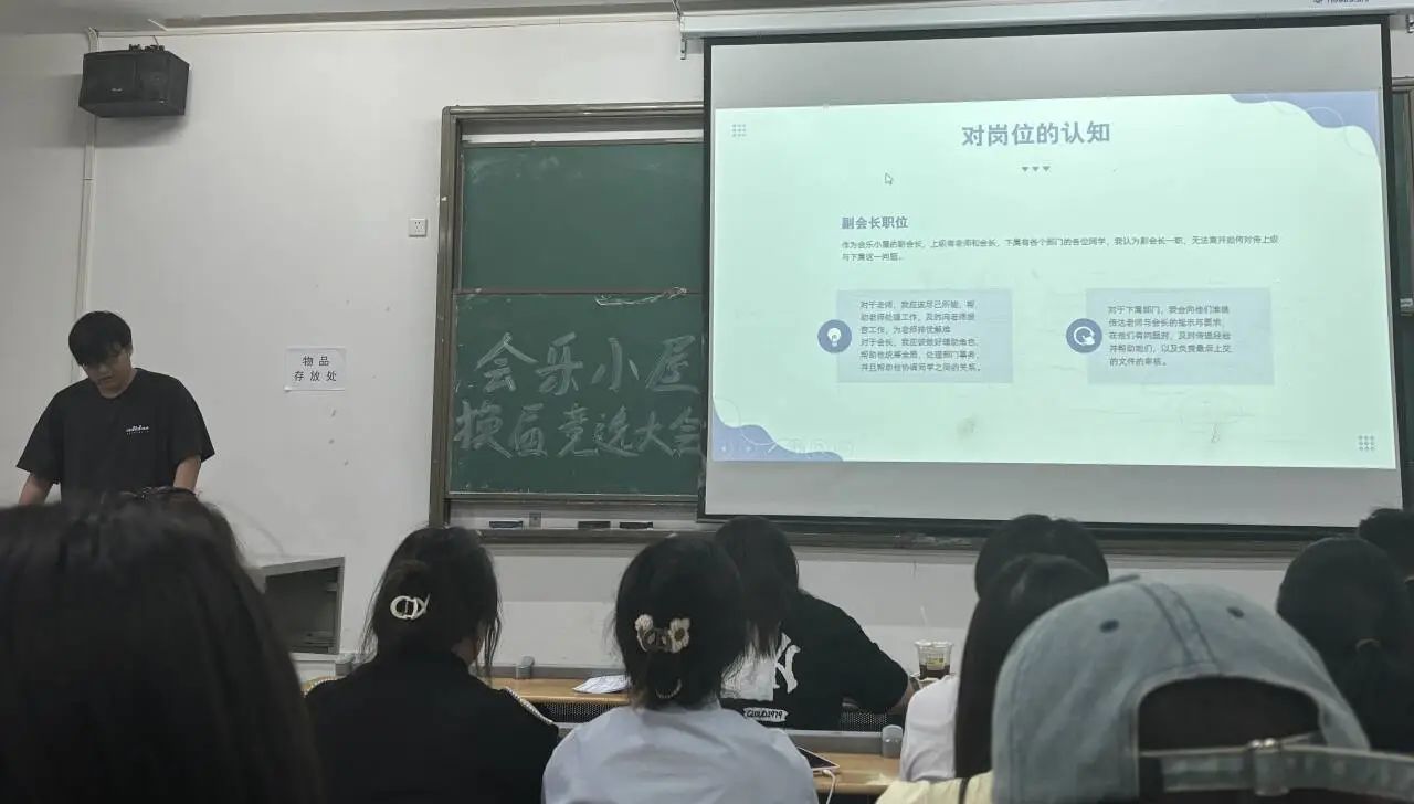 随后,吴欣悦、李京书、王雨、胡桂米、程雨璐和齐妙同学,纷纷上台发言竞选部长或副部长。通过她们对自己的优势分析以及岗位认知,可以看出她们对工作的态度与决心。六位干事都希望在会乐小屋发散别样的光彩,在部门建设中发挥卓越的作用。