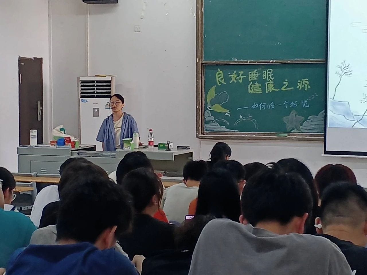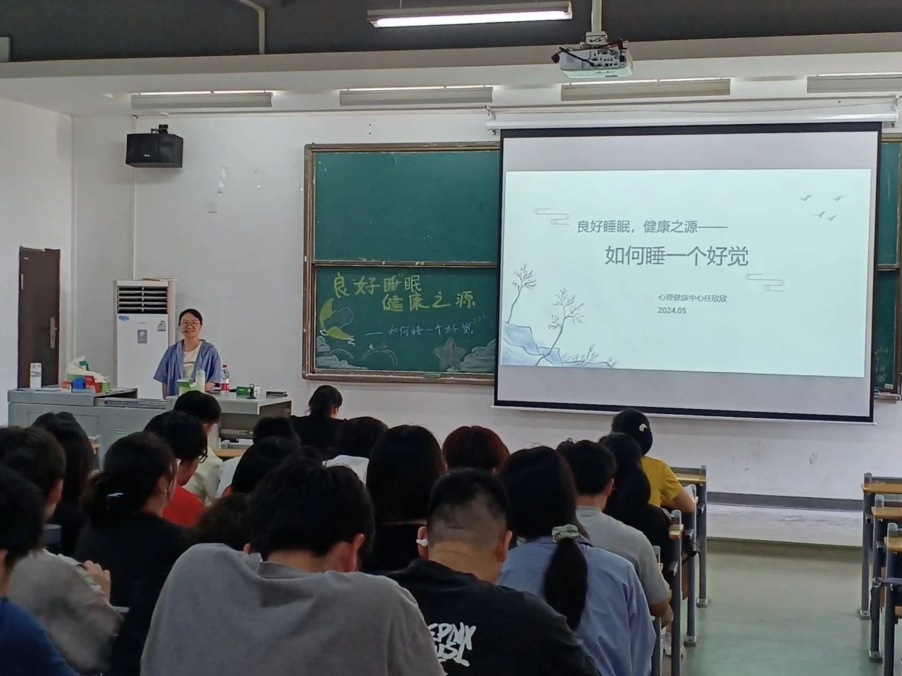 在快节奏的现代生活中,大学生们面临着诸多压力,其中睡眠问题尤为突出。为帮助同学们改善睡眠质量,以便于更好的生活与学习,我院特邀大学生心理健康中心的任欣欣老师带来专题讲座“良好睡眠,健康之源——如何睡一个好觉”。本次讲座由太阳成城集团tyc234cc心理工作站会乐小屋活动部干事胡桂米主持,任欣欣老师主讲,于2024年5月8日在教1-201开展。