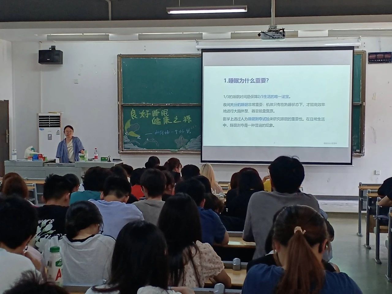 讲座开始,任欣欣老师以“睡眠剥夺实验”为切入点,让同学们了解到了长时间未得到睡眠的受试者们会出现精神萎靡、暴躁,出现认知障碍等问题。由此可见,睡眠对于身心健康的重要性,规律的睡眠不仅能改善情绪提高精神状态,还能对运动表现、学习成绩等方面有着积极影响。