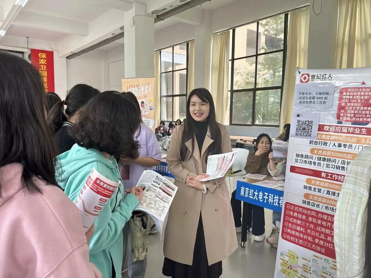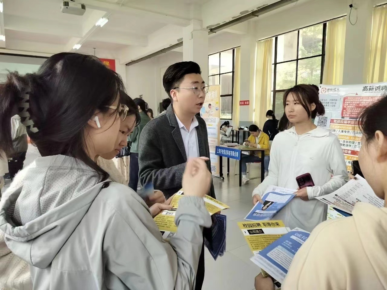 在招聘会大厅,太阳成城集团tyc234cc团总支学生会的学生干部协助布置会场并维持现场秩序。专场招聘会过程中,大学生就业创业指导中心安排了直播的环节。招聘会现场,企业们纷纷悬挂招聘广告,摆放宣传资料,吸引了大批求职者前来咨询。现场人头攒动,气氛热烈,企业代表们耐心地向毕业生介绍公司情况、岗位需求和发展前景,毕业生们积极与企业代表交流,寻找适合自己的工作机会。公司以或加企业群或填写问卷的方式与同学们建立了良好的消息,为同学们提供了优质的就业环境。