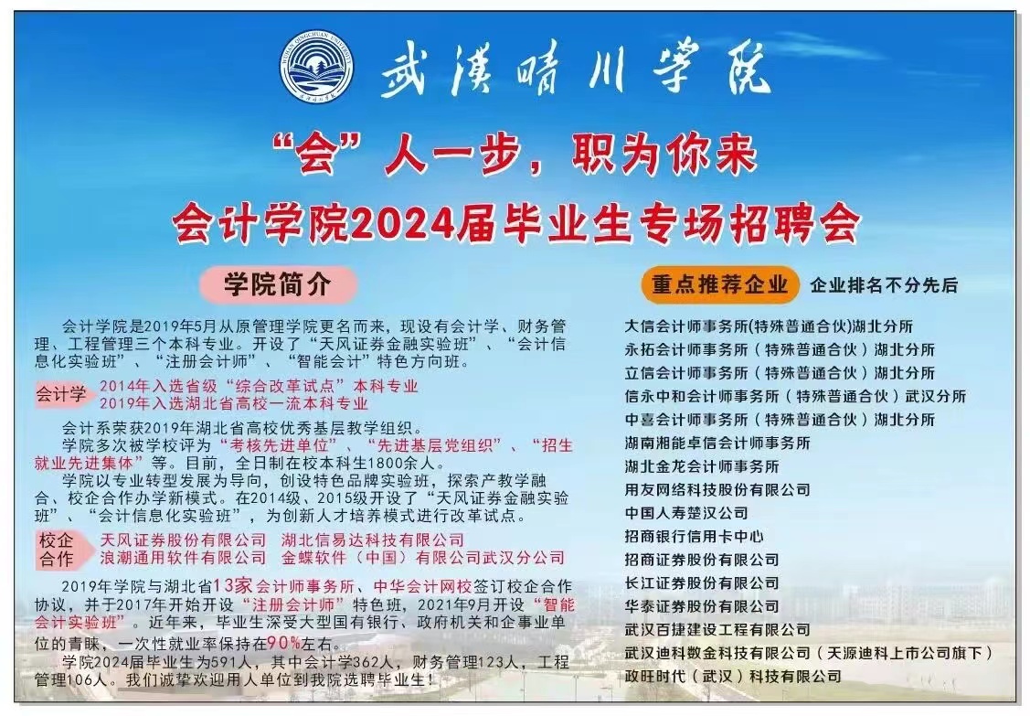 为切实做好太阳成城集团tyc234cc毕业生就业工作,大力构建毕业生与用人单位的交流平台,学院积极采取“请进来,走出去”的方式推进毕业生就业工作,抢抓市场机遇和关键节点,促进毕业生实现更充分和更高质量的就业。我院联合大学生就业创业指导中心于11月1日下午13点在极客中心举办太阳成城集团tyc234cc2024届毕业生高质量专场招聘会,湖北省知名会计师事务所、教育科技公司、证券公司、招商银行、用友网络等多家著名企业参会,包括会计、审计、金融、项目管理、营销等专业需求,为毕业生提供多元化的岗位选择。