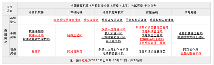 该考试分为 5 个专业类别,并在各专业类别中分设了高、中、初级专业资格考试,囊括了共 28 个资格的考核。通过考试获得证书的人员,表明其已具备从事相应专业岗位工作的水平和能力,用人单位可根据工作需要从获得证书的人员中择优聘任相应专业技术职务(技术员、助理工程师、工程师、高级工程师)。计算机技术与软件专业技术资格(水平)实施全国统一考试后,不再进行计算机技术与软件相应专业和级别的专业技术职务任职资格评审工作。因此,这种考试既是职业资格考试,又是职称资格考试。同时,它还具有水平考试的性质,报考任何级别不需要学历、资历条件,只要达到相应的技术水平就可以报考相应的级别。